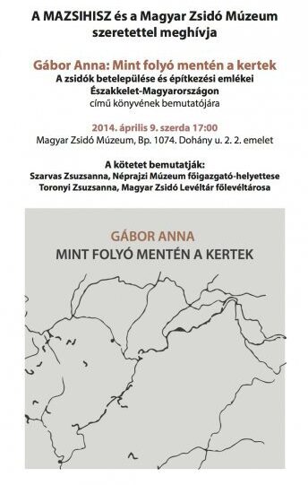 A Mazsihisz és a Magyar Zsidó Múzeum szeretettel meghív minden érdeklődőt Gábor Anna: „Mint folyó mentén a kertek, a zsidók betelepülése és építészeti emlékei Északkelet Magyarországon” című könyvének bemutatójára a Magyar Zsidó Múzeumba.