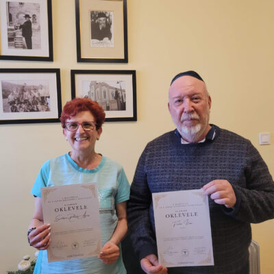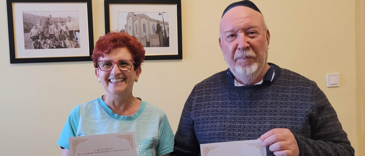 Címlapkép: Erdősné Pollák Ágnes és Flecker István a Mazsihisz Együtt-Egymásért Programjának elismerő oklevelével, amelyet Kósa Judit és Fejes Emőke adott át
