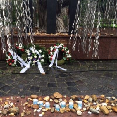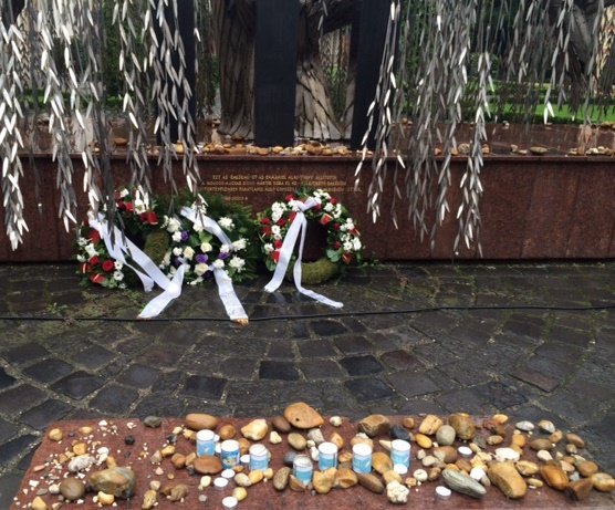 A megemlékezés végén Navracsics Tibor, Ilan Mor és Heisler András koszorút helyezett el a zsinagóga udvarán, a Raoul Wallenberg-emlékparkban. (MTI)