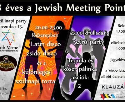 A JMPoint a Zsidó Közösségért Közhasznú Alapítvány nyolcadik éve dolgozik önzetlenül értetek, és ezennel szeretnénk meghívni szombat este (november 13. 19.00-tól) a születésnapi rendezvényünkre Budapest szívében a Váci utca 60-as száma alatt található Verne Club és Étterembe! Kedvezményes árú jegyeket még lehet kapni a Klauzál13 és az IKI könyvesboltokban!