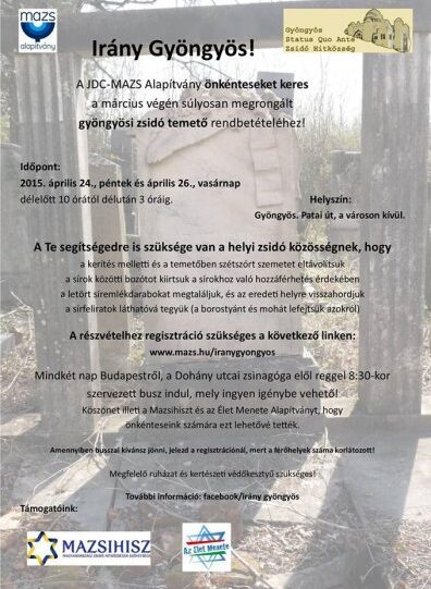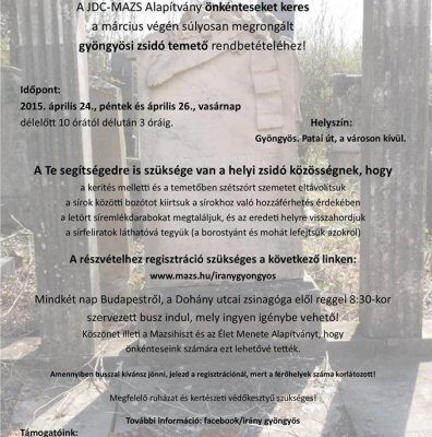 A JDC-Joint Magyarország (MAZS Alapítvány) és a Magyarországi Zsidó Hitközségek Szövetsége önkénteseket keres a március végén súlyosan megrongált gyöngyösi zsidó temető rendbetételéhez. Időpontok: 2015. április 24. péntek, délelőtt 10:00 órától délután 3 óráig és április 26. vasárnap, délelőtt 10:00 órától délután 3 óráig.