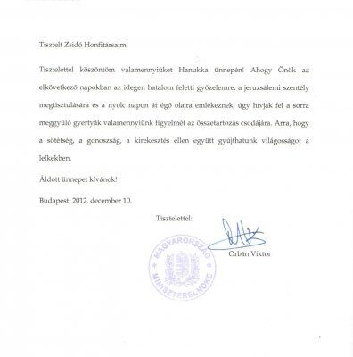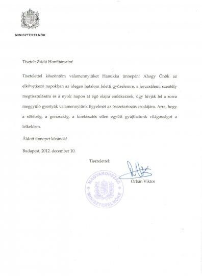 Tisztelettel köszöntöm valamennyiüket Hanukka ünnepén! Ahogy az elkövetkező napokban az idegen hatalom feletti győzelemre, a jeruzsálemi szentély megtisztulására és a nyolc napon át égő olajra emlékeznek, úgy hívják fel a sorra meggyúló gyertyák valamennyiünk figyelmét az összetartozás csodájára. Arra, hogy a sötétség, a gonoszság, a kirekesztés ellen gyújthatunk világosságot a lelkekben.