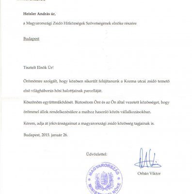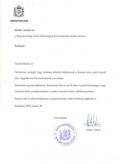 Orbán Viktor miniszterelnök Heisler Andrásnak. a Magyarországi Zsidó Hitközségek Szövetsége elnökének írt levelében fejezte ki jókívánságait a magyarországi zsidó közösségnek abból az alkalomból, hogy közösen sikerült felújítani a Kozma utcai zsidó temető első világháborús hősi halottainak a parcelláját. Az alábbiakban a levél tartalmát közöljük.