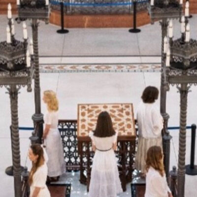 partizánnőkhöz hasonló életkorú fiatalok olvasnak fel nekünk a zsinagóga