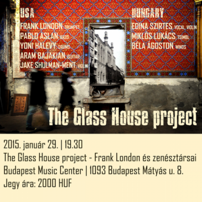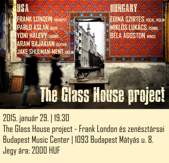 A Glass House Projectben január 29-én a BMC-ben – a Balassi Intézet-New York-i Magyar Kulturális Központ szervezésében – Frank London mellett Pablo Aslan bőgőzik, Yoni Halevy dobol, Aram Bajakian gitározik, Jake Shulman-Ment hegedül, Lukács Miklós cimbalmozik, Ágoston Béla fúvós hangszereket szólaltat meg, Szirtes Edina Mókus pedig énekel és hegedül.