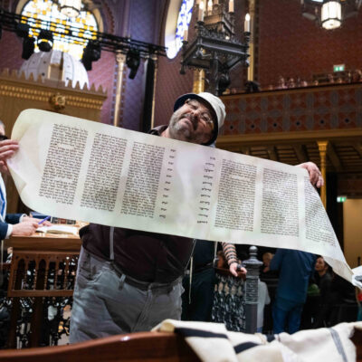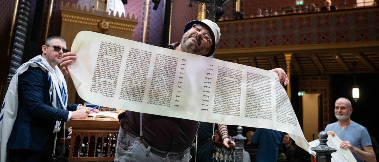 A szombati esti mulatságot vasárnap délelőtt egy igazi családi program követte a Rumbach zsinagógában. A nézőtér gyorsan megtelt, és együtt hallgathattuk, ahogy Radnóti és Deutsch rabbik felolvassák a Megilát. A gyerekek ajándék kereplőkkel űzték el Hámán emlékezetét.