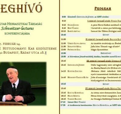 Schweitzer-lectures – a Magyar Hebraisztika társagás tisztelettel meghív minden érdeklődőt dr.Schweitzer József, néhai országos főrabbi az Országos Rabbiképző Intézet volt igazgatója halálának második évfordulóján megrendezendő emlékkonferenciára, 2017. február 14. kedd, 9:00 órára a Károli Gáspár Református Egyetem (KRE) Hittudományi karának dísztermébe. Pontos cím: Budapest IX. ker., Ráday u. 28.)