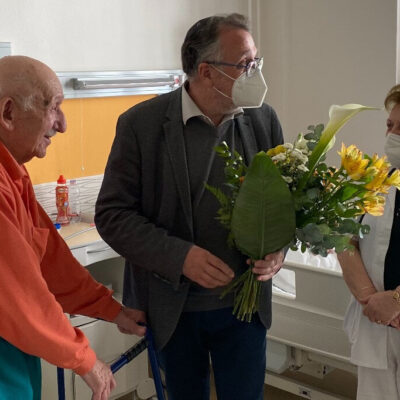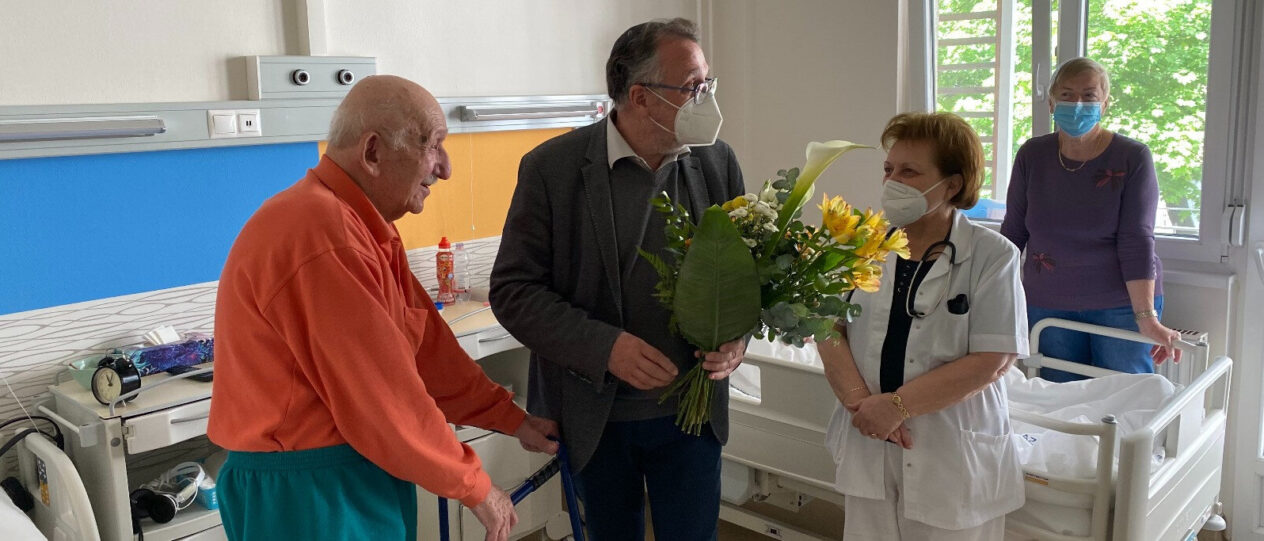 A kórházi köszöntésen Imre bácsi szívesen mesélt életéről, felidézte a vészkorszak eseményeket, amely során többször is hajszálon múlt az élete.