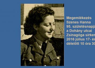 A Mensch Nemzetközi Alapítvány szervezésében megemlékezés Szenes Hanna 95. születésnapján a Dohány utcai Zsinagóga sírkertjében, 2016. július 17. (vasárnap) délelőtt 10:30 órakor. Az eseményre minden érdeklődőt szeretettel várnak a szervezők.