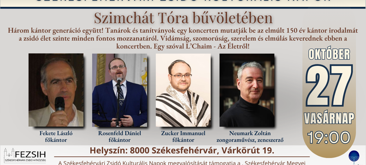 A Székesfehérvári Zsidó Kulturális Napok keretében 2024. október 27-én, vasárnap este 7 órakor tanárok és tanítványok különleges koncerten mutatják be az elmúlt 150 év kántor irodalmát a zsidó élet szinte minden fontos mozzanatáról. A koncert pontos helyszíne: Székesfehérvár, Várkörút 19. I. emelet.