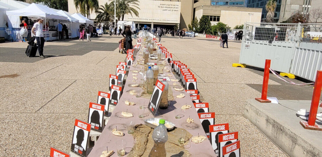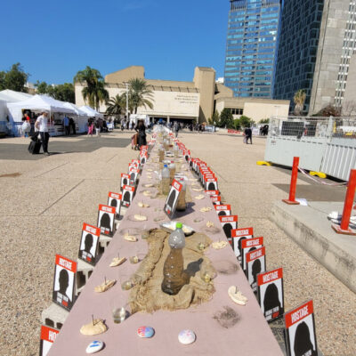 A tel-avivi művészeti múzeum előtti tér az elmúlt hetekben megtelt olyan installációkkal, amelyek a terroristák által elrabolt túszokra emlékeztetnek. A téren nagyon sok diákot látni, akik a saját maguk által készített tárgyakkal fejezik ki együttérzésüket. Ezt a helyet is fölkereste a Mazsihisz delegációja, amely múlt héten járt a Zsidó Államban.