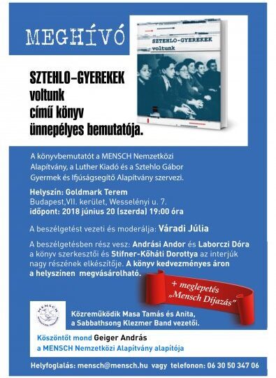 Minden érdeklődőt szeretettel várunk a Sztehlo-gyerekek voltunk című könyv ünnepélyes bemutatójára, 2018. június 20. (szerda) 19:00 órára a budapesti Goldmark-terembe (Budapest VII. ker. Wesselényi u. 7.)