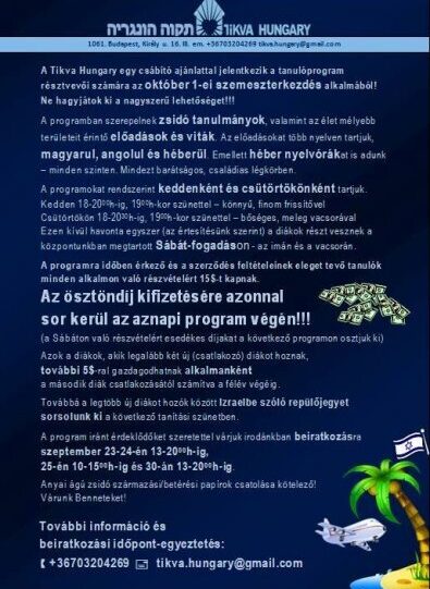A Tikva Hungary egy csábító ajánlattal jelentkezik a tanulóprogram résztvevői számára az október 1-ei szemeszterkezdés alkalmából! Ne hagyjátok ki a nagyszerű lehetőséget! A programban szerepelnek zsidó tanulmányok, valamint az élet mélyebb területeit érintő előadások és viták.