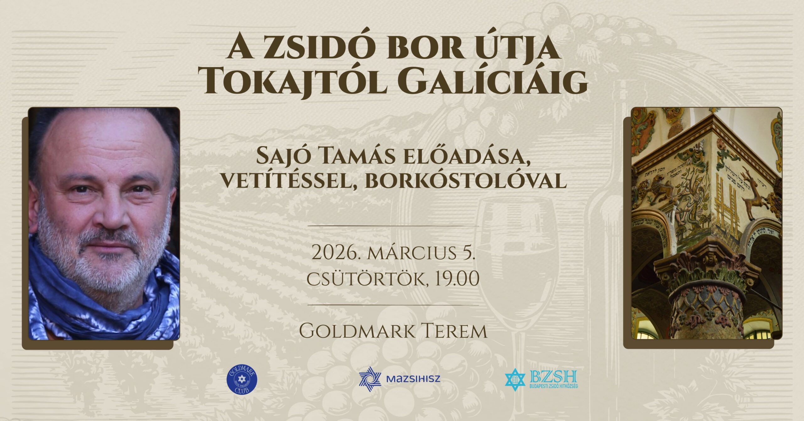 Dr. Sajó Tamás művészettörténész tart vetítéssel egybekötött előadást, amelyet borkóstoló is kísér. Az este képzeletbeli utazásra hívja a közönséget a tokaji hegyektől Galícia haszid központjaiig, boron és történeteken át. A belépő ára 2900 forint, az ülőhelyek elfoglalása érkezési sorrendben történik.