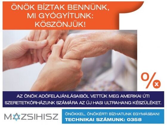 Mazsihisz hírek Önök bíztak bennünk, mi gyógyítunk – kérjük adója 1%-ával segítse idén is munkánkat 2017. február 20. - 13:26