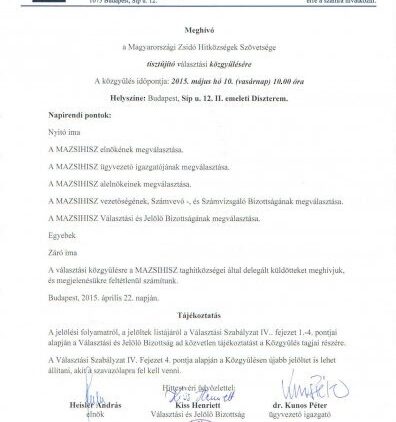 Mazsihisz hírek Meghívó a Magyarországi Zsidó Hitközségek Szövetsége tisztújító választási Közgyűlésére 2015. április 23. - 12:07
