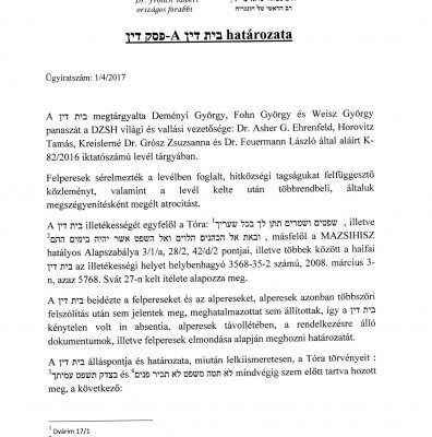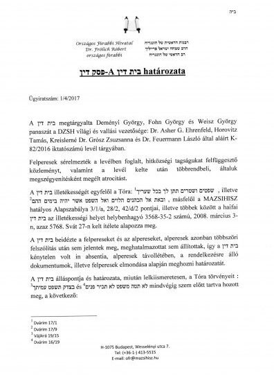 A Debreceni Zsidó Hitközség jelenlegi vezetésének belső ellenzékét egy helyi döntés kiparancsolta a gyülekezetből, ők pedig vallási bírósághoz fordul, amelynek határozata szerint három hívünk kizárása gyengítette a közösséget, nem alkalmazott egyenlő mércét és indokolhatatlanul megszégyenítő eljárássá vált. Nem helyes, ha kitaszítunk híveket magunk közül – figyelmeztet az ítélet.