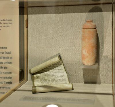 A Holt-tengeri tekercsek a Szentföldön valaha talált legfontosabb régészeti leletek közé tartoznak. A leletek között vannak bibliai könyvek és szekta-szövegek, a tekercseket egy zsidó csoport, valószínűleg az esszénusok tagjai írták, akik a Második Templom i.sz. szerinti 70-es lerombolását megelőző két évszázadban Qumranban éltek a Holt-tenger nyugati partján. A tekercseket barlangokban rejtették el, hogy megvédjék őket a rómaiak várható ostromától. Ezek másolatai is láthatók a kiállítási anyagban.