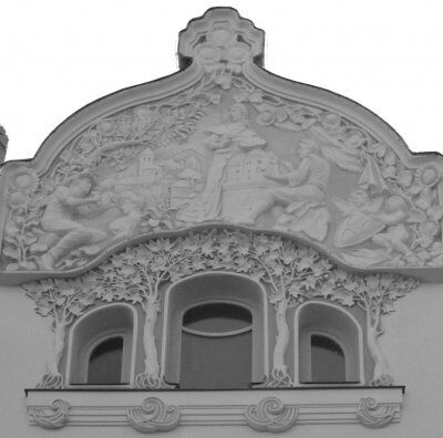 Az épület homlokzatának másik különlegessége a főtengelyt lezáró íves oromzat, melyben gipszdombormű foglal helyet a művészetek, vagyis a Festészet, Szobrászat és Építészet allegorikus figuráival bemutatva. A házat az 1990-es évek végén a jelenlegi tulajdonos (a Resonator Vagyonkezelő Kft.) igényesen helyreállíttatja.