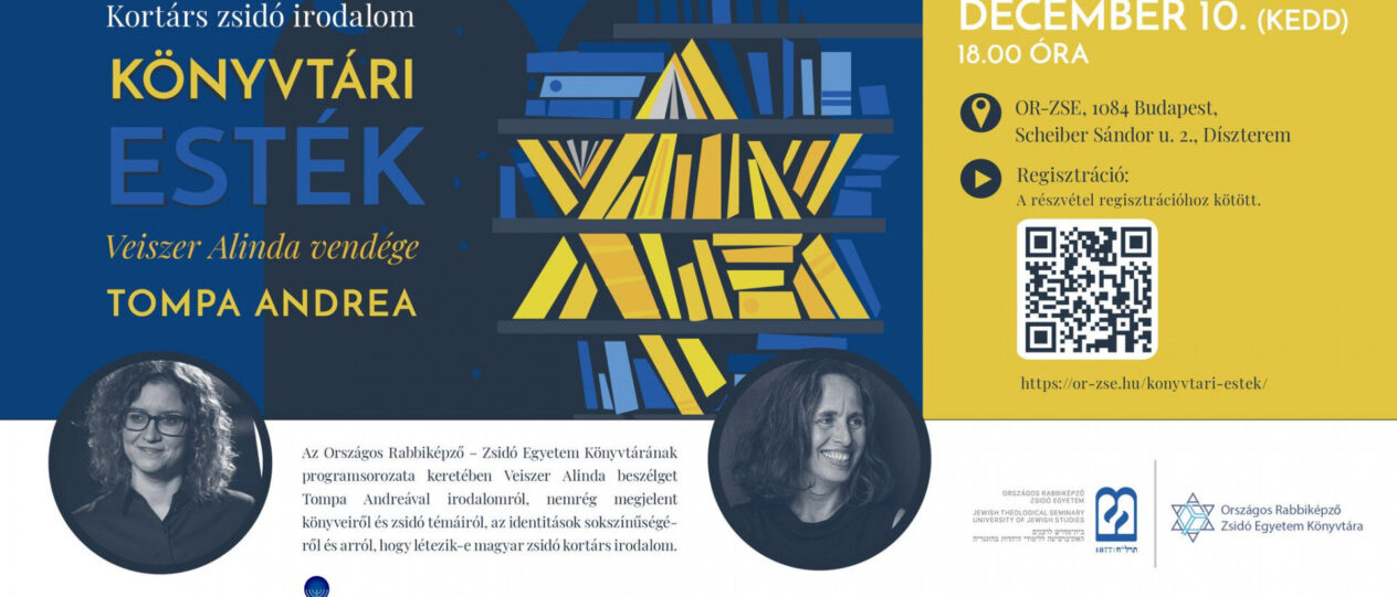 Az Országos Rabbiképző – Zsidó Egyetem (OR-ZSE) Könyvtára sorozatában Veiszer Alinda újságíró beszélget egy-egy kortárs magyar íróval. A rendezvény-sorozat következő vendége Tompa Andrea, a beszélgetés december 10-én, azaz holnap este 6 órakor kezdődik az OR-ZSE dísztermében. A részvétel ingyenes, de regisztrációhoz kötött!