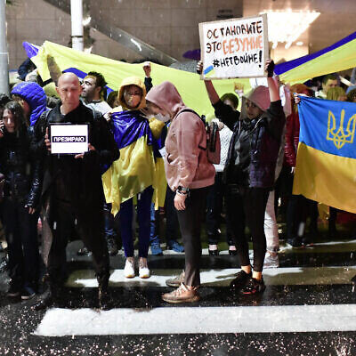 Csütörtök este a zuhogó esőben több százan tüntettek Tel-Avivban az orosz nagykövetség előtt, ily módon fejezve ki tiltakozásukat a Vlagyimir Putyin elnök által indított ukrán megszállás ellen. A 13-as csatorna esti riportja szerint a demonstrálók közül sokan ukrán gyökerekkel rendelkeznek, vagy akár a háborús zárlat alatt álló országban rekedt családtagjaik életéért aggódnak – olvasható az izraeli magyar nyelvű Új Kelet internetes portál cikkében.