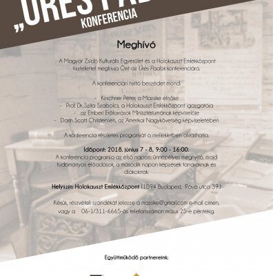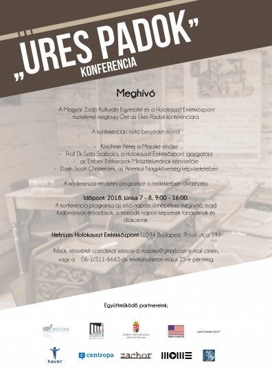 A Magyar Zsidó Kulturális Egyesület és a Holokauszt Emlékközpont tisztelettel meghívja Önt az Üres Padok című két napos konferenciára. A Konferencia időpontja: 2018. június 7-8., helyszíne a Holokauszt Dokumentációs Központ (Budapest IX. ker., Páva u. 39.)