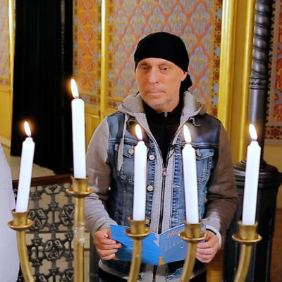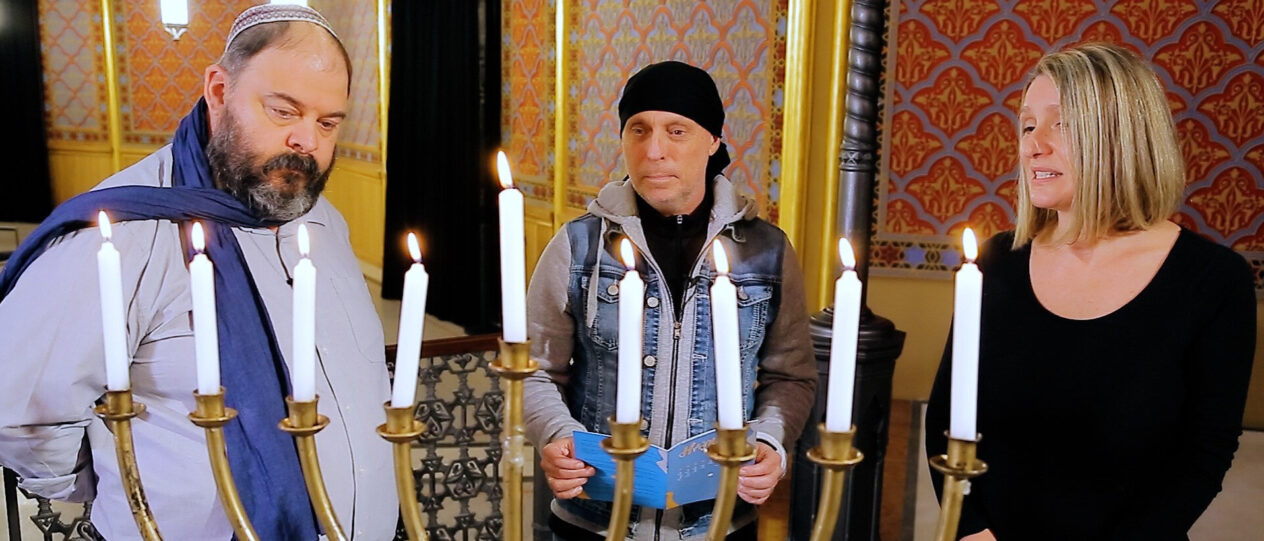 Várkonyi Attilát Kiss Henriett az intézmény vezetője kalauzolta körbe a zsinagógában és Radnóti Zoltán főrabbi, a Lágymányosi Bét Sálom zsinagóga vallási vezetője avatta be hanuka ünnepének történetébe.