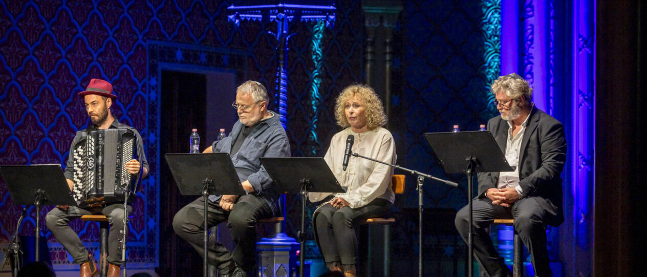 Az irodalmi anyag viszonylag rövid, de fájdalmasan sűrű időszakon ívelt végig, maga Máté Gábor, továbbá Bánsági Ildikó és Görög László megszólalásaival meg Móser Ádám harmonikajátékával – ez utóbbira még külön szándékozom kitérni. Ívet mondtam, de ez a deportálásoktól a megsemmisítő táborok felszabadításáig tartó történet számos olyan kitérőt is tartalmazott, amelyek szinte végtelen horizonttá változtatták a Rumbach zsinagóga színpadára állított műveket – úgyhogy Máté Gábor már csak ennek a sokféleségnek a kiválogatásáért és egybeszerkesztéséért is valamiféle irodalmi-szerkesztői díjat érdemelne…