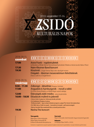 A Pápa és Környéke Zsidó Kulturális Hagyományőrző Egyesület, 2018. szeptember 15-16. között Zsidó Kulturális Napokat szervez a város zsinagógájában. A szervezők koncertekkel, előadások múltról és jelenről, zsidó ízek kóstolójával, játszóházzal és Dr. Róna Tamás főrabbi meséivel várják az érdeklődőket.